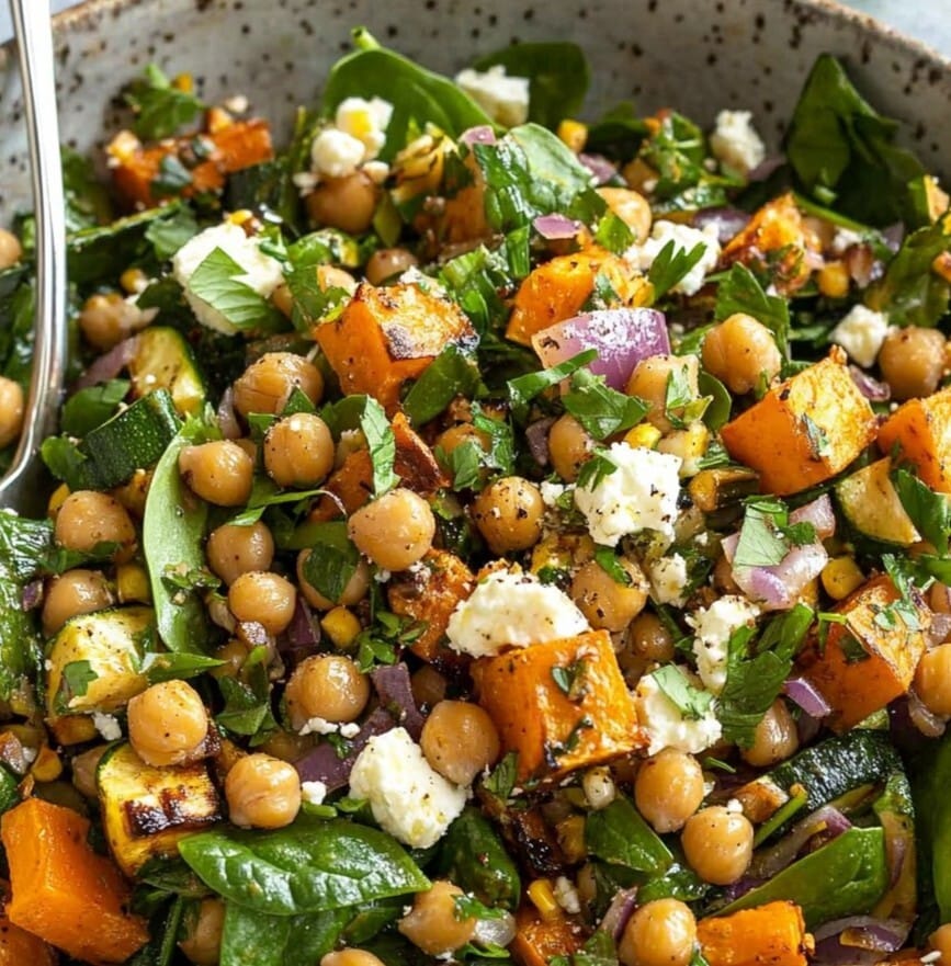 This Roasted Zucchini and Sweet Potato Salad from Feasting at Home is a vibrant, healthy dish made with roasted sweet potatoes, black beans, corn, red bell pepper, and scallions, all tossed in a zesty chipotle-lime dressing. It's hearty, smoky, and slightly spicy—perfect as a side dish or light main, and great for meal prep, picnics, or potlucks. Naturally vegan and gluten-free! Full Recipe Available HERE.